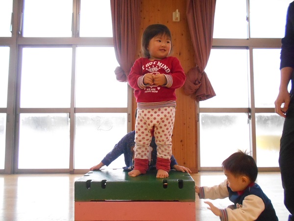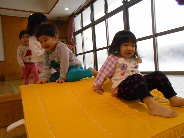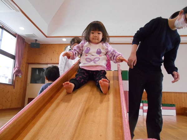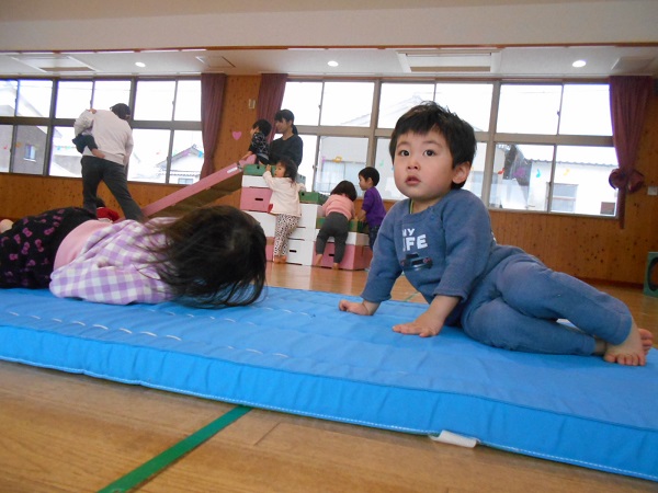 今日は遊戯室でトンネルやすべり台、山などのサーキット遊びをしました。