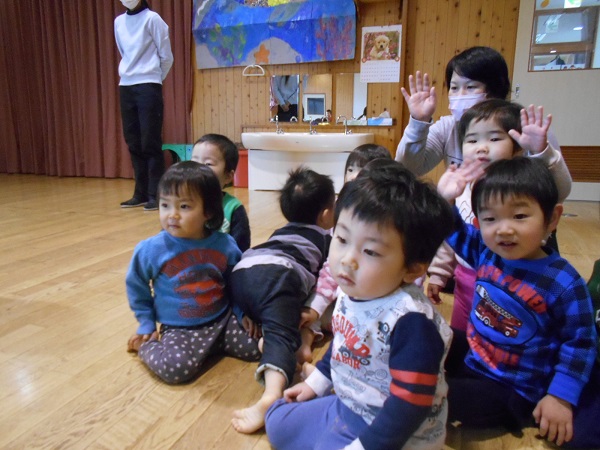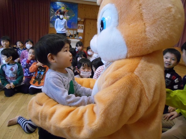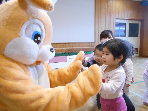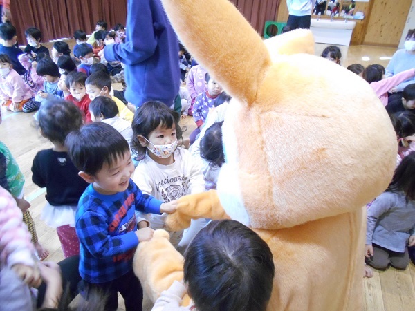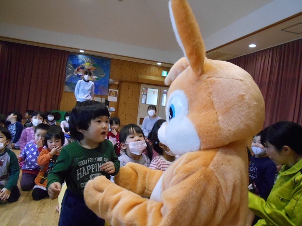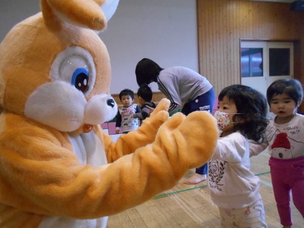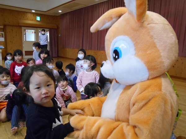 2018年01月31日 大好き♪サヒメルからうさぎのマスコットキャラクターが遊びに来てくれました✨うさぎさんに「おーい!!」と手を振って喜ぶりんご組さんでした!うさぎさんにぎゅーっと抱きついたり、握手をしたりと嬉しそうなみんな。何度も触れ合いに行くお友だちもいましたよ!ちょっぴり緊張してしまったお友だちもいましたが、うさぎさんが大好きな子ども達でした♪