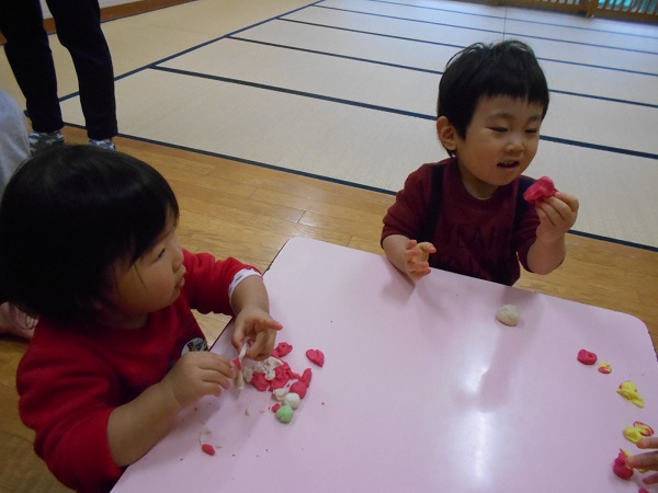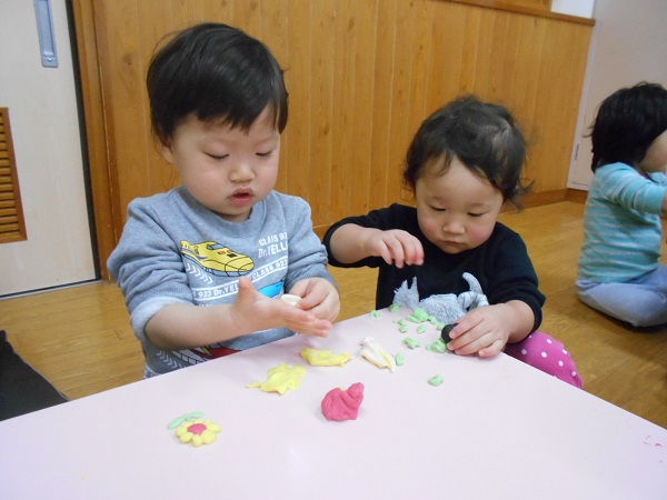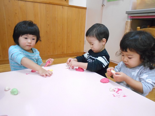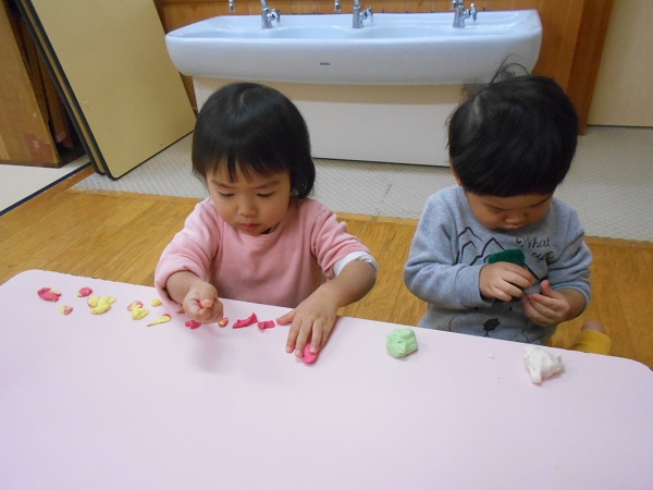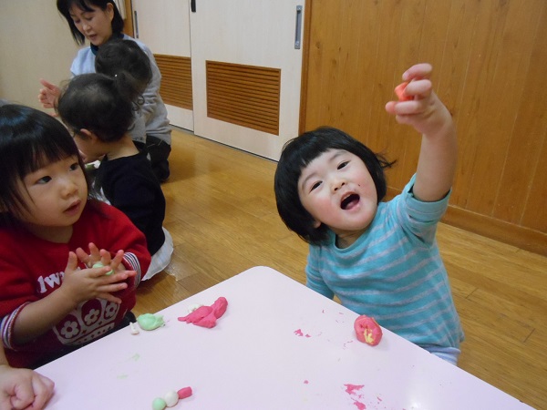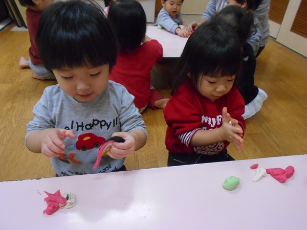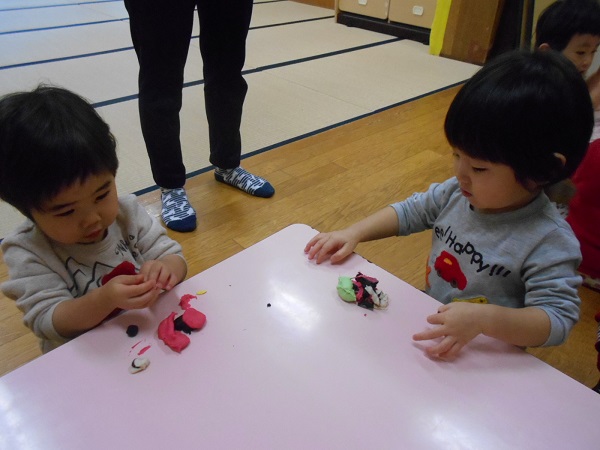 2018年01月15日 カラフル♪今日は小麦粉粘土をして遊びました☆カラフルな粘土に大喜びのりんご組さん♡小さくちぎったり...細長く伸ばしたり...★「みかんできたよ~!」「これはいちご~❤」先生のまねっこをして、粘土でお花作りに挑戦!!ちょっと難しいかな?でも集中してがんばっていました☆最後には全部くっついて、おおきなお団子に!カラフルな小麦粉粘土☆とっても楽しかったね■