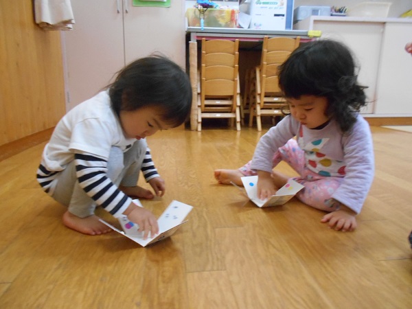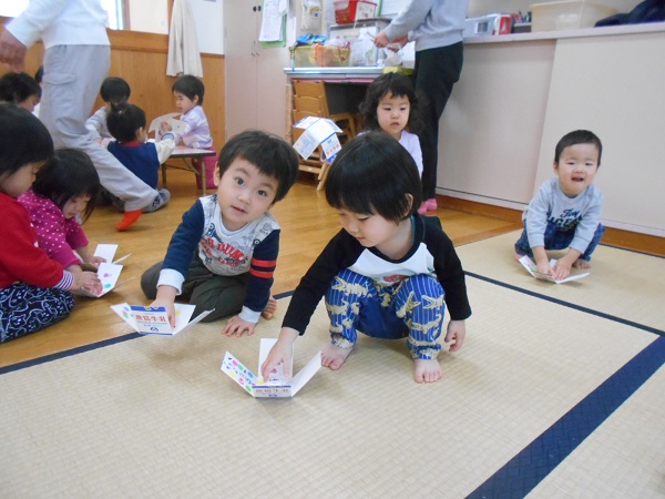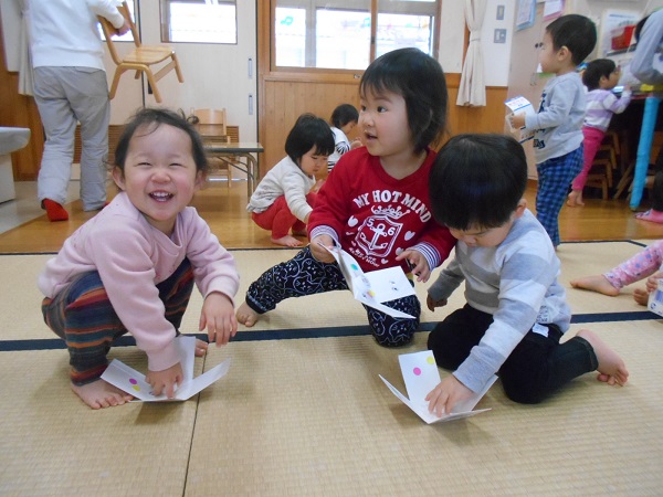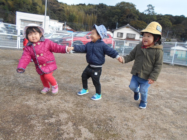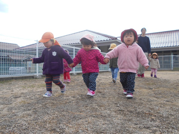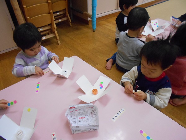 2018年01月16日 コマ回し☆今日はコマを作って遊びました☆まずは牛乳パックにシール貼りをして飾りつけ♪みんな真剣な表情です!飾りつけが終わると、早速みんなで回して遊びました♬くるくると回るコマを見て、「まわったー!」と大喜びのりんご組さんでした■コマ回しをして楽しんだ後は、園庭に出て体を動かして遊びました☆手を繋いでお散歩ごっこ!とっても仲良しのりんご組さんです♡
