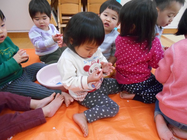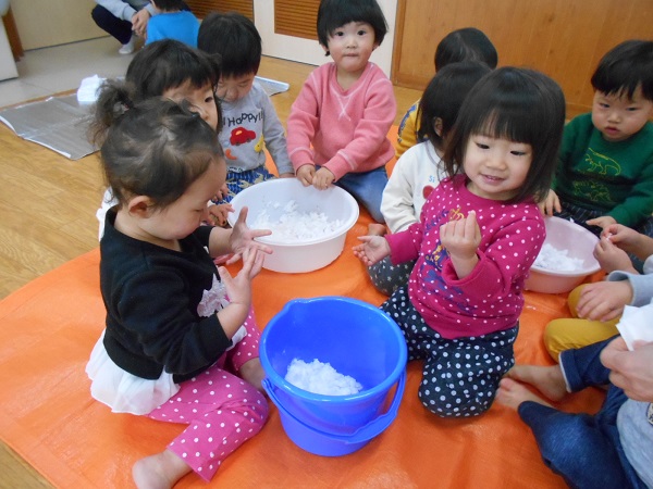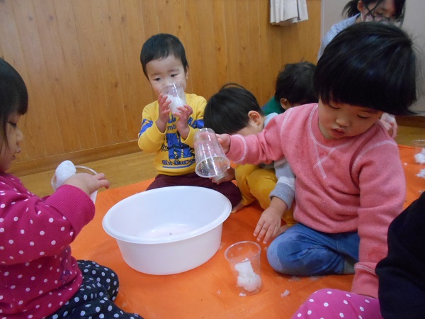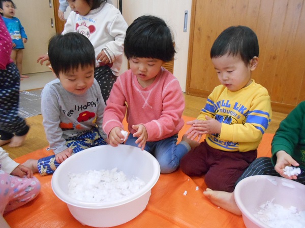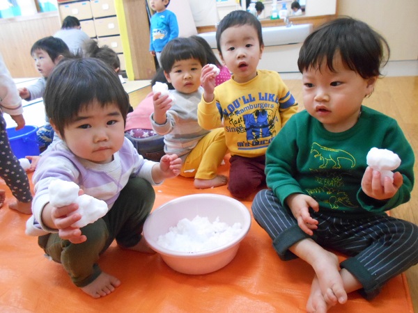 2018年01月24日 冷たいね!!今日は、外から雪を取ってきて、お部屋で雪遊びをしました♬「ゆき!」「つめたい!」とおしゃべりしながら、大喜びで遊ぶりんご組さん■溶けてどんどん小さくなる雪玉を、不思議そうに見つめるお友だちも...☆「見てみて~雪だるま作ってもらったよ⛄」溶けて水になってしまうまで、夢中になって遊ぶりんご組さんでした♡