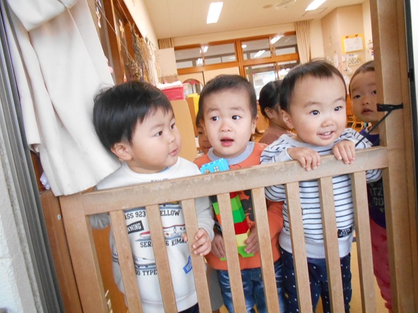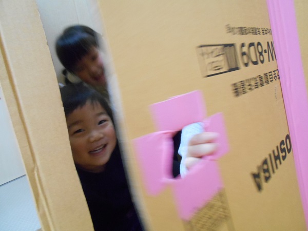 製作や段ボールで遊んでいると、廊下の方から・・・リンリン♪