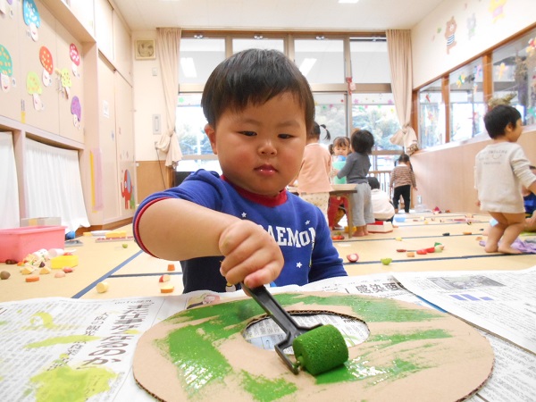 ローラーを使って丸型のダンボールをぬりぬり~♪