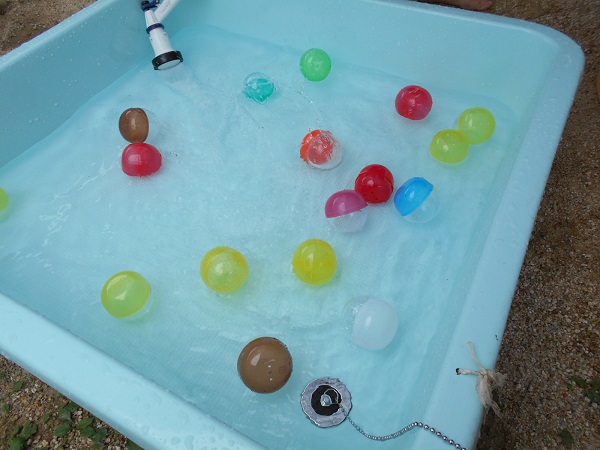 今日はタライに、ガチャガチャのカプセルをいっぱい入れてみましたよ☆