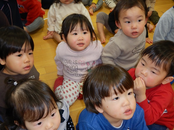 誕生児さんをじっと見つめ、インタビューを聞くりんご組さんです■