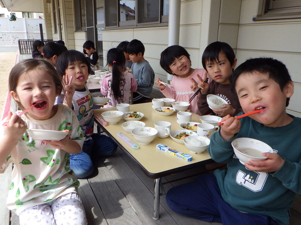 桜シャワー☆ 2024年04月11日 ろけっと組になって初めて全員が揃ったので、喜多の宮の前で恒例の集合写真を撮りました。 桜の花びらが散っていて、地面は桜のじゅうたんに♡ 花びらを集めて、桜のシャワーを浴びました(笑) 天気が良かったので、テラスで給食を食べました♡ いつもと違う場所で食べて、お喋りが弾んでいましたよ♡ 火災を想定した避難訓練がありました。 非常ベルが鳴ると、すぐに保育者の周りに集まり、手やハンカチを口元に当てて待機することができました。