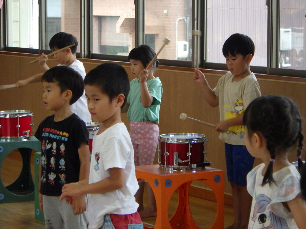かわいいお客さん☆ 毎日、少しずつソーラン節や合奏の練習をしているろけっと組さん♡ 今日は、みかん組の可愛いお友だちにその様子を見てもらいましたよ♡ 「きんちょうするー!!」「ドキドキする!!」と、いつもと違う雰囲気に少し緊張気味な子どもたちでしたが、始まってしまえばいつものようにニコニコ笑顔で披露することができました♡ 先日描いた夏まつりのポスターに文字を書きました。 着々と夏まつりの準備が進み、ワクワクが止まらないろけっと組さんです☆