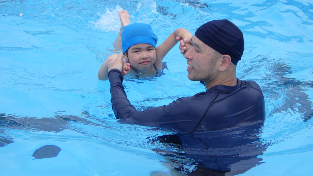 板の上は、子どもたちのお臍くらいの水深ですが、板のないところは、子どもたちの顔くらいまでの深さなので、最初は板の上で遊んでいましたが、慣れてくると保育者と手をつないでバタ足をしたり、ビート板を使って気持ちよさそうに泳いだりしていましたよ♡