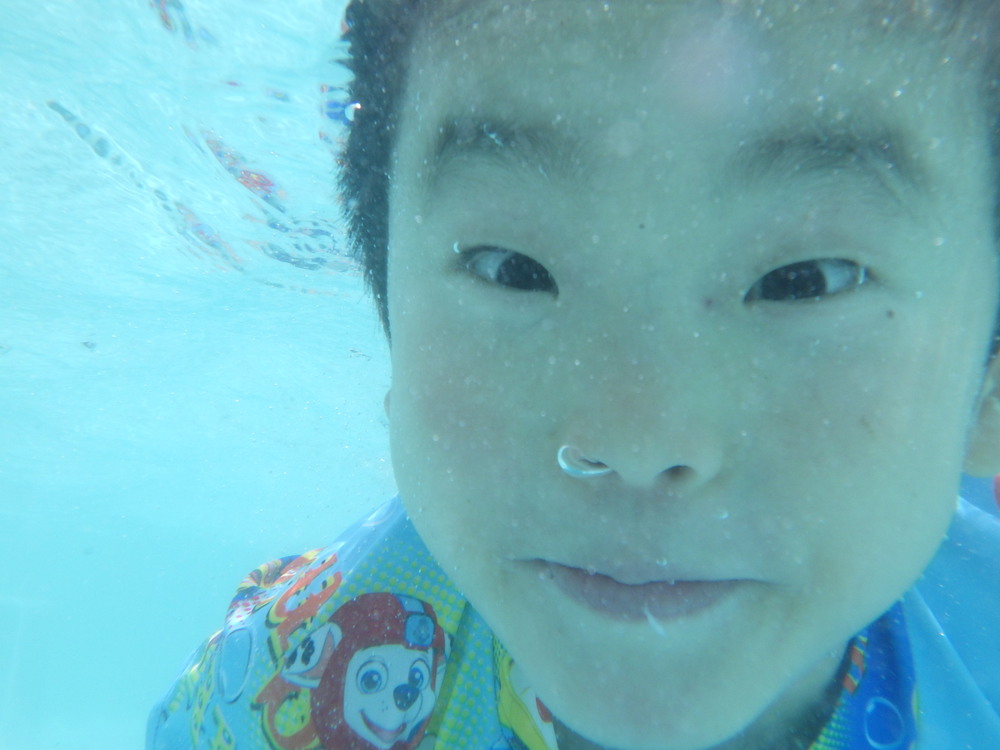 水しぶき☆ プールに入り、顔つけやバタ足をしましたよ。足の力も強くなり、バタ足をすると水しぶきがすごいことに…(笑) 保育者の背中に乗って、「あ~楽チン♡」と楽しむ子や、プールに潜って目を開けて泳ぐ子など自分のスタイルで楽しんでいましたよ♡