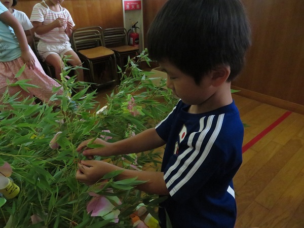 できあがった飾りを笹につけていきます。