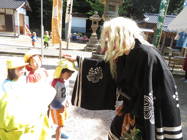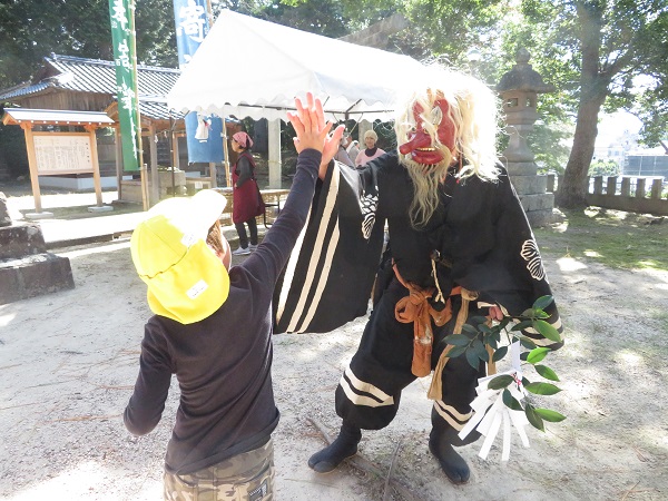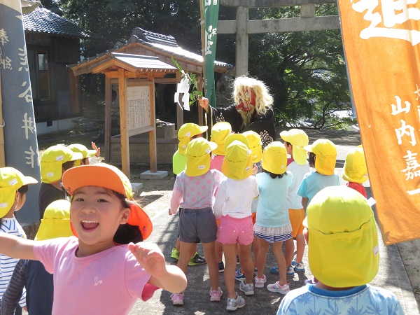 天狗に会いに行きました!行くまでは涙が出ていたお友だちもいましたが、「天狗さんと握手したら一年元気に過ごせるよ!」