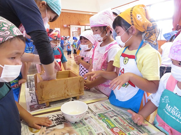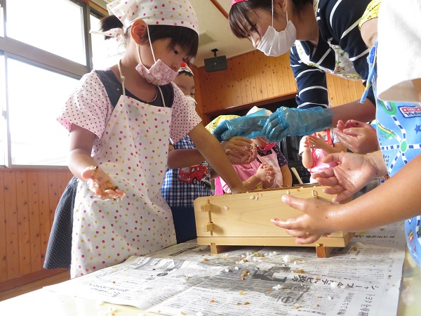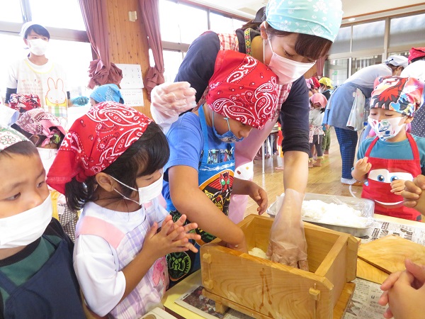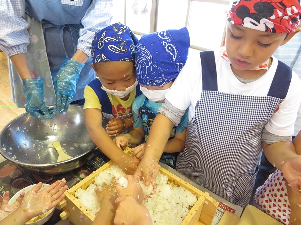食育ボランティアの方や一日保育士体験に来られたお母さん達にお手伝いしていただきながら、みんなで箱寿司作りをしました☺