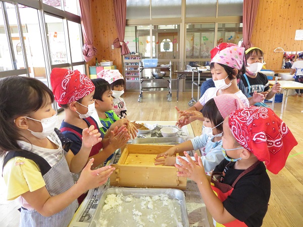 作っているうちにお腹が空いて「いい匂いだね、はやく食べたいね♡」とわくわくする子ども達。