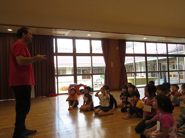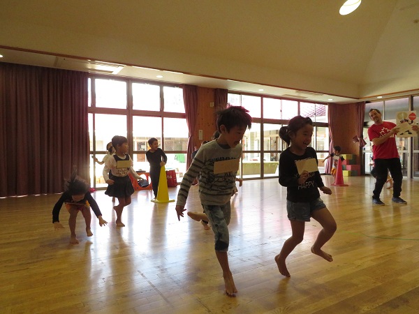 Run、jump、walk、hopなどの指示に従ってグルグルまわるのですが、「Redlight!」と言われるとピタッと止まらないといけません。「だるまさんが転んだみたいだね!」と大盛り上がりでした。