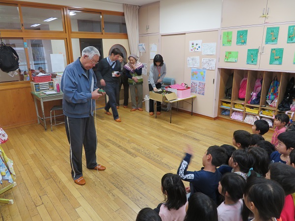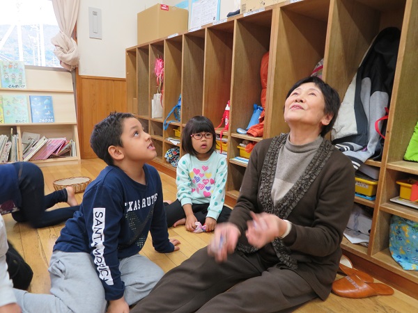 給食までの時間は、カルタやお手玉、こま回しをして楽しみました。