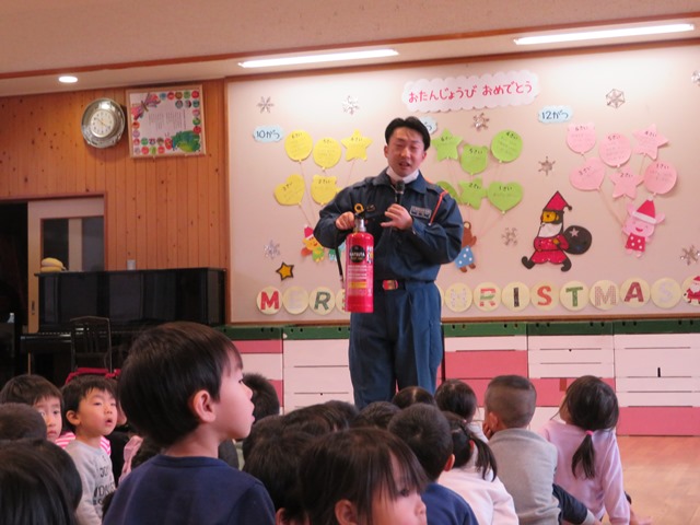 「消化器はバケツの水9杯分の力があるよ」「電気や油が原因の家事だと水をかけてはいけないけど、消化器なら大丈夫だよ。」と言う消化器の話を真剣に聞いていました。
