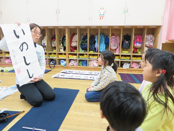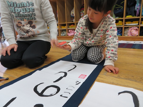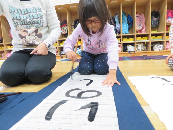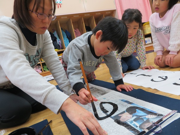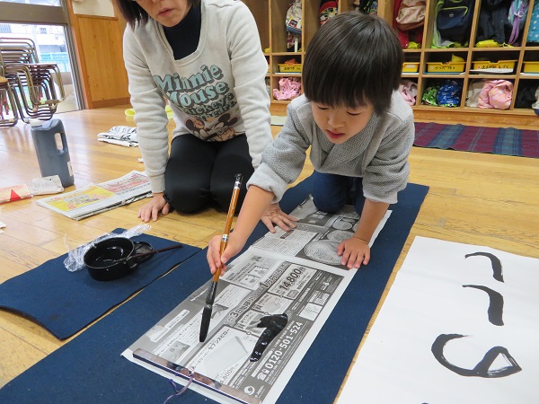 2018年12月26日 お正月の準備!お正月を迎える準備を着々と進めているろけっと組さん。今日は来年の干支『いのしし』を書きました。まずは新聞紙を使って練習。緊張したようで一枚書き終わると「ふぅー」とひと息。いつもより太い筆を使い、大きな半紙に書きました。落款を押し、完成!しーんとした空間で一文字一文字丁寧に書きました。玄関に飾るのでお楽しみに!