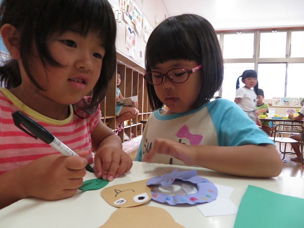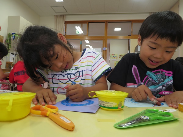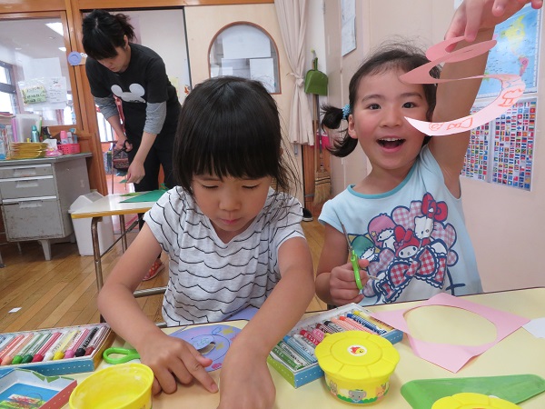 2018年05月31日 かたつむり♪かたつむりの製作をしました■模様をかいたり線に沿ってハサミで切ったり...「できた!こんな形~!」ひらがなが書けるようになったろけっとさん。名前も自分で書きました✐一つひとつ模様や表情の違った可愛いカタツムリが完成しましたよ♡ろけっと組の部屋の前に飾ってあるので是非見て下さいね♪