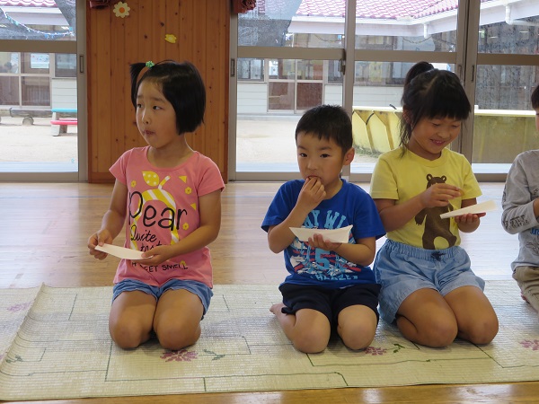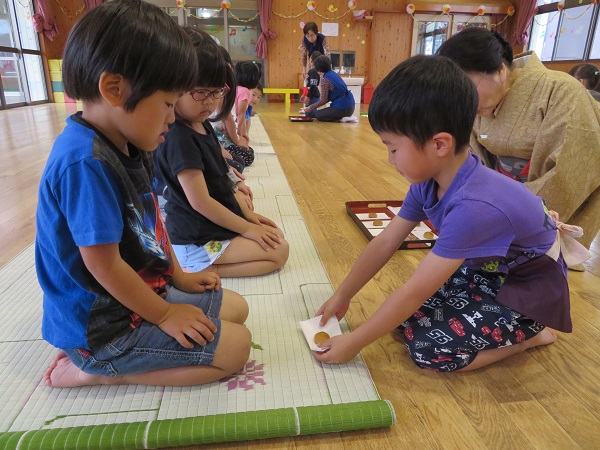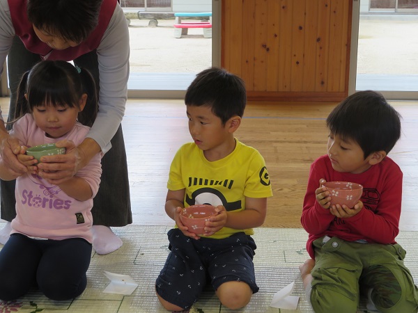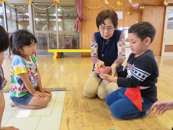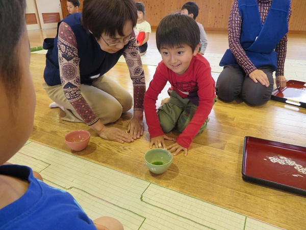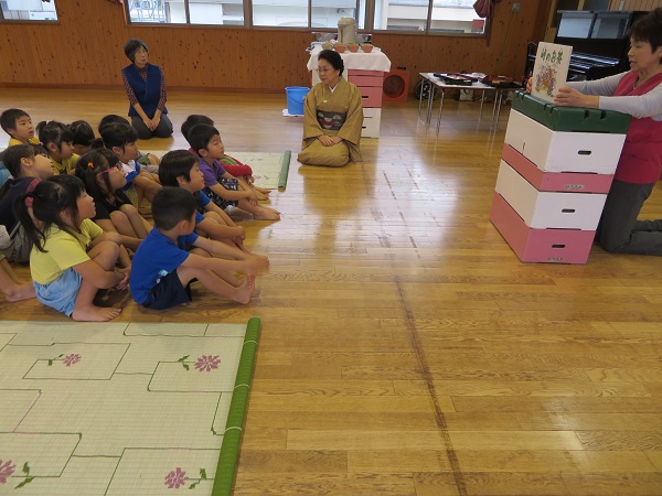 紙芝居を見ました。お茶をもてなしてあげたいという気持ちが大切だと学びました。