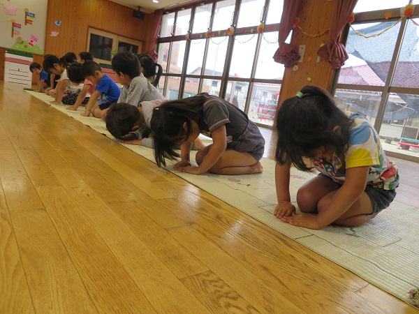 お辞儀の作法も教えてもらいました。これは『真』のお辞儀です。真のお辞儀は手のひらを床のすべてつけます。この他に『行』『草』と合わせて3種類のお辞儀があります。