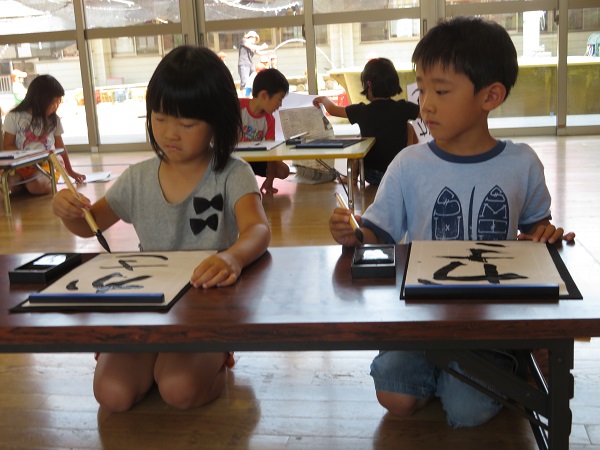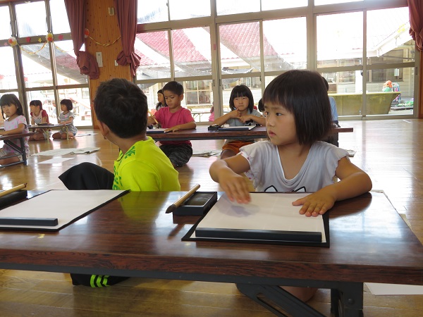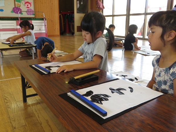 2018年06月25日 習字の日!今日は月に一回の習字の日です。『かさ』という字を書きましたよ。まずはお手本を見ながら、手で書いてみます。さぁ!いよいよ墨をつけて書きますよ!習字を通してひらがなに興味を持った子どもさんもおられます。職員と一緒に練習しながら、正しい書き順や形の定着を目指します。今日の作品が玄関に飾ってあります。ご覧ください。