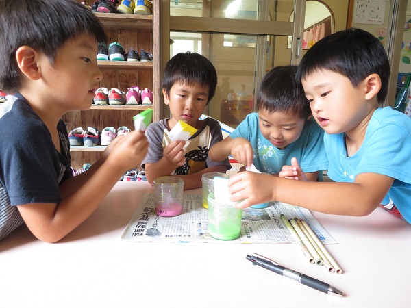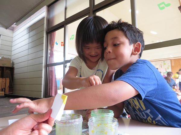 2018年06月28日 七夕飾り☆染紙遊びをしました。障子紙を小さく折って、絵の具の中にちゃぽん!「絵の具がどんどん染みてきた~✨」一つひとつ違った模様ができましたよ♡乾いたらこの紙を使って七夕飾りを作ります■お昼寝の前は...昨日つけた梅の実をみんなで観察■「水が増えてる!」「梅が茶色になってる!」と色々な発見がありました!明日はどうなってるかな☺?