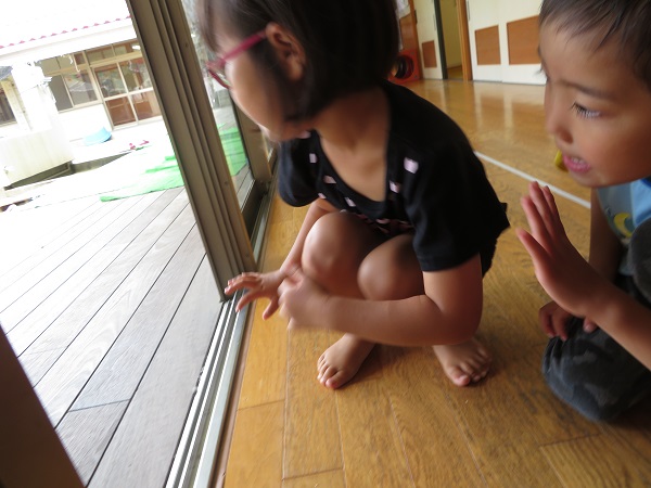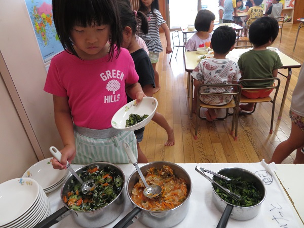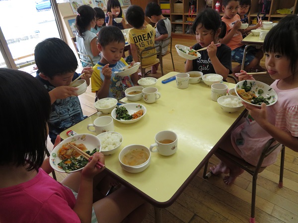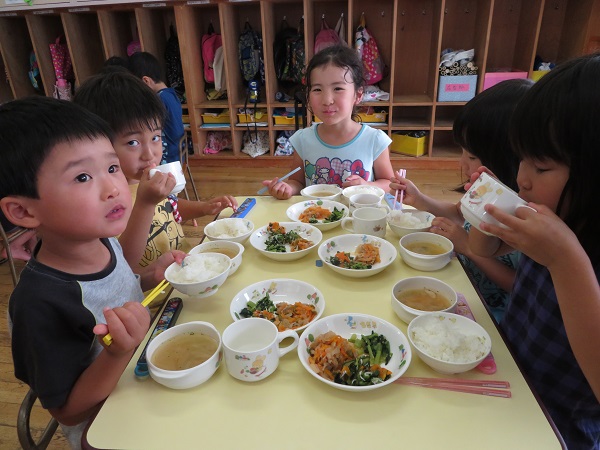 2018年06月20日 みーつけた!園庭に向かって「ばいばーい」誰に言っているのかと思ったら・・・蛍でした!「捕まえたらかわいそうだよね、蛍・・・」「逃がしてあげなきゃ」といいながら、遠くに飛んでいくのを見送りました。さてこちらは・・・給食の準備です。ごはんをよそうのが難しいようです。うまくできた!みんなでおいしくいただきまーす■