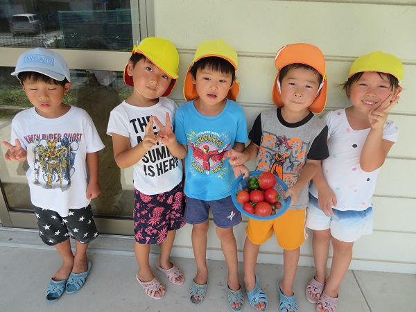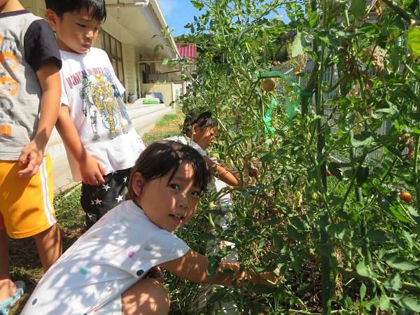 トマトが太陽の日差しを浴びて、たくさん育っています。