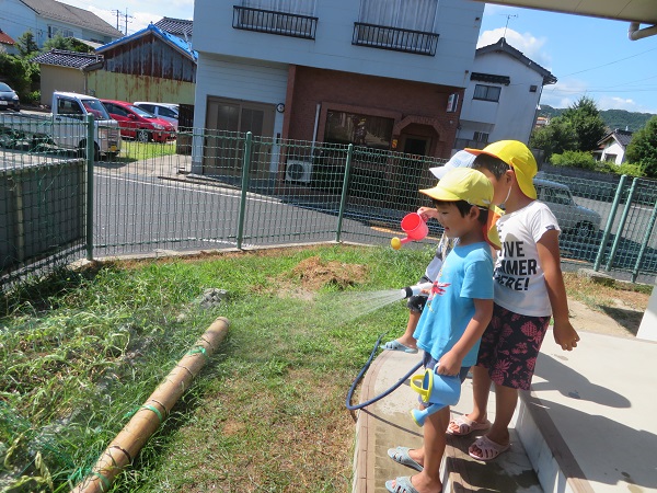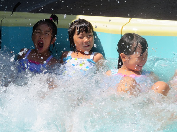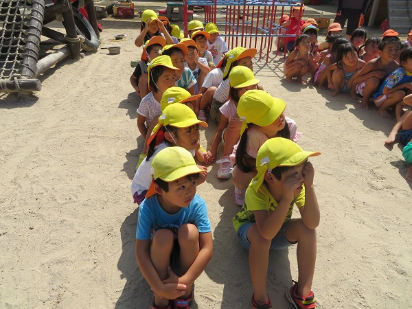 上手に避難が出来ました。訓練が終わったらお待ちかねのプール遊びです。