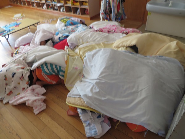 お部屋で遊んでいると「地震です」の声...すぐに反応して集まることが出来ました。布団で頭を保護して守ります。日頃の練習が大事ですね。