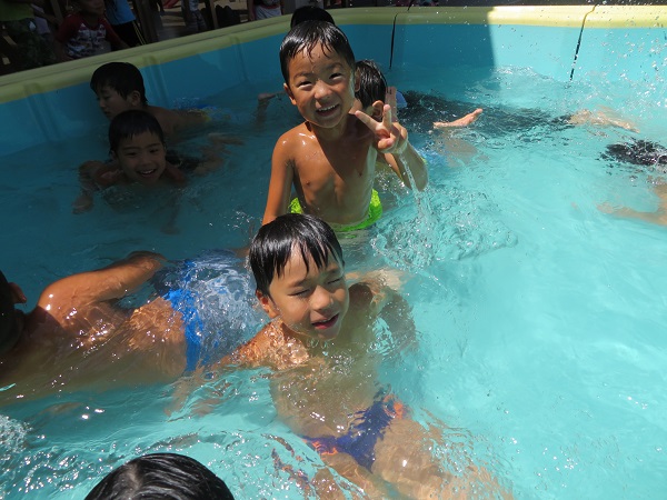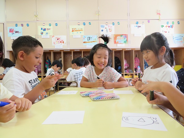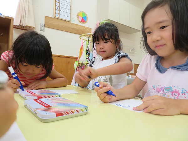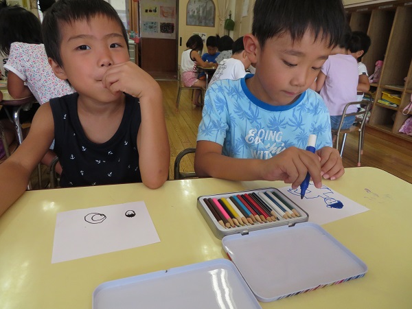 2018年08月07日 新チーム!お当番のグループが新しくなりました✨お当番表に使う顔を描いて...今日は色鉛筆で色を塗りました✐チームの名前は何にしよう...?悩みに悩んでそれぞれ自分達で名前を考えましたよ。その後は今日も大好きなプール&泥んこ遊び!!日に日に水着の跡がくっきりつくほどこんがり日に焼けてきたろけっとさんです♡