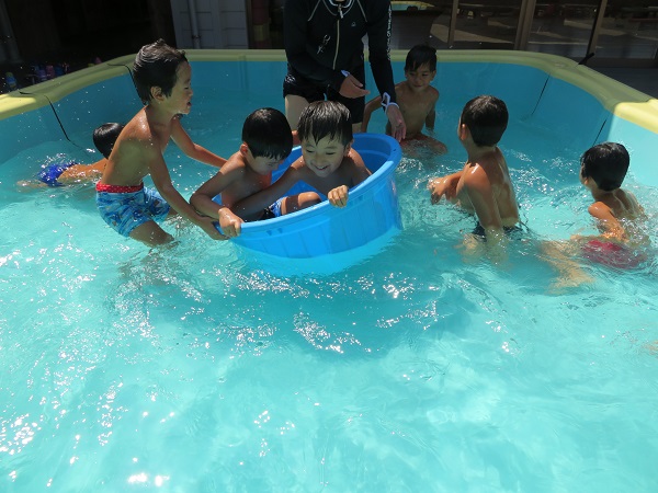 2018年08月27日 どんぶらこ♪タライの船に乗ってどんぶらこ~■2人で上手くバランスを取らないと沈んでしまいます...■プール遊びも最後の1週間。毎日のプールが楽しくて仕方ないろけっとさんです♡明日も元気に遊ぼうね✨