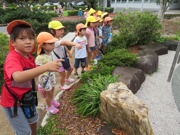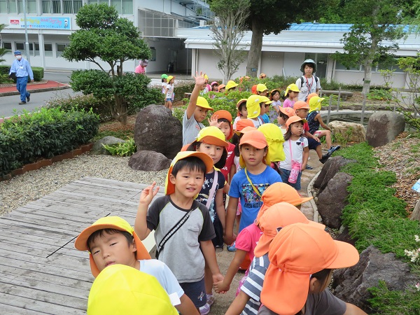 2018年09月14日 散歩大好き!ひこうき組とイワミ村田製作所に行きました。季節ごとに花を咲かせる植物の変化を楽しみましたよ。大きな鯉を見るもの大好きです。たくさん歩くことは体力作りにも繋がります。様々な散歩コースを楽しみたいと思います。