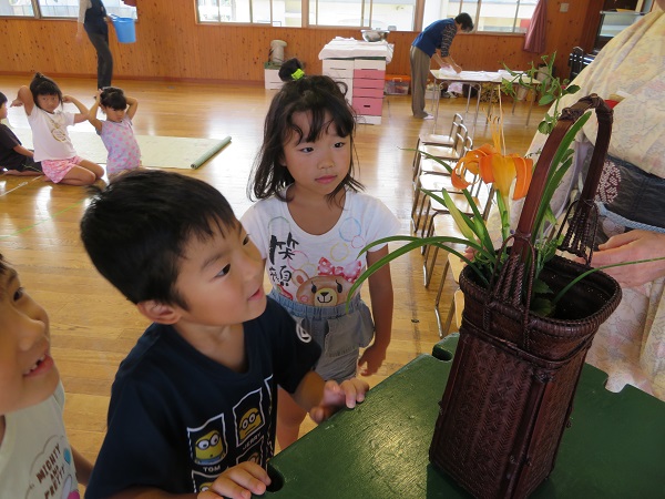 先生が活けられる花に、「綺麗だね■」「可愛い色だね」とうっとり見惚れる子ども達。