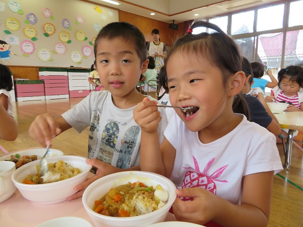 炊き立てのご飯のおこげを味わいながら、大好きなカレーライスを幸せそうに頬張るろけっとさん♡
