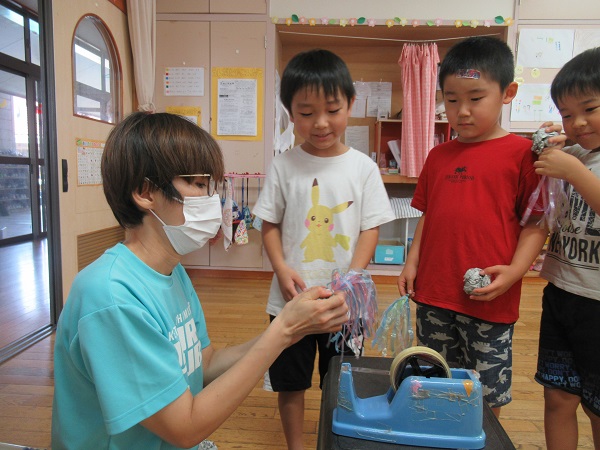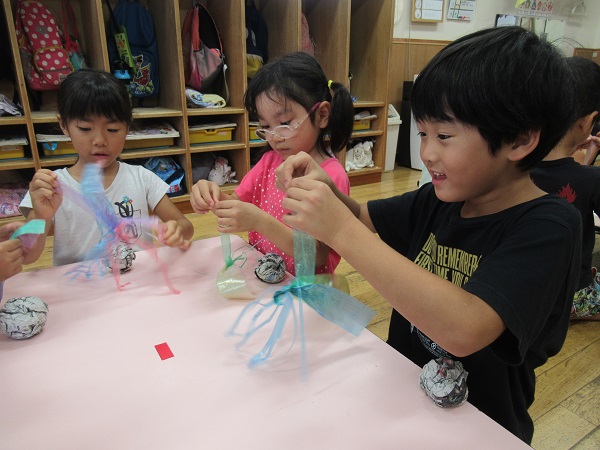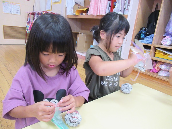 新聞が丸まったら、スズランテープを細く裂いて、ボールにつけるシャラシャラしたポンポンを作りました。