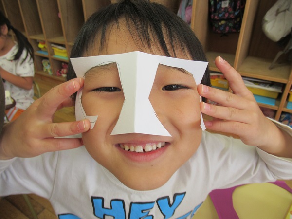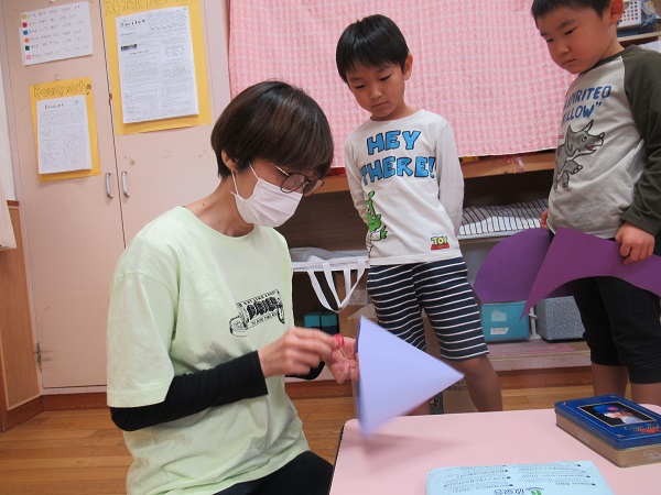 先ほど切った大きな画用紙を保育者にホッチキスで止めてもらい、帽子の形ができました。