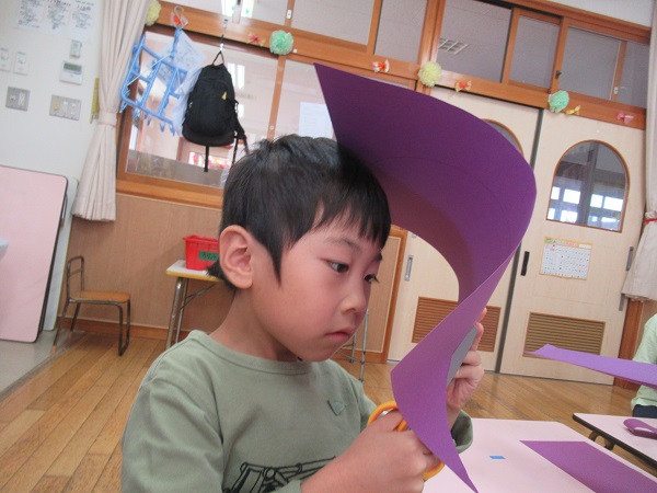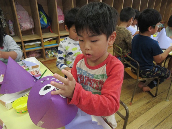 ハロウィンごっこに向け、仮装のための帽子を作りました。