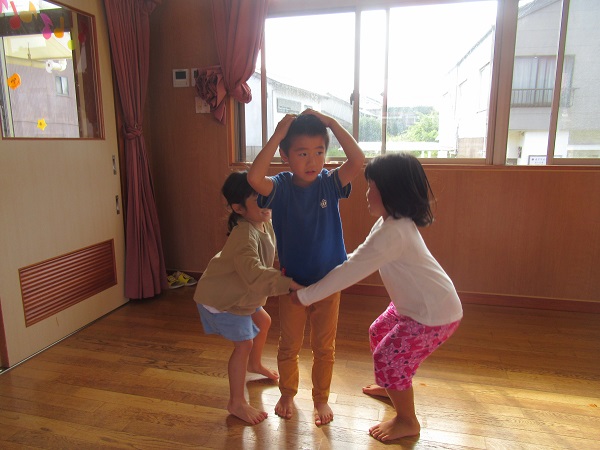 二人一組で手を繋いで電子レンジに変身し、「電子レンジでチン!」と唱えると、タッチをされて固まっていた子は、復活することができます。