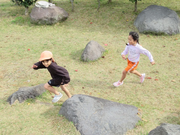 椿の実をた~くさん見つけた後は、岩場や木陰で思いっきり遊びました。