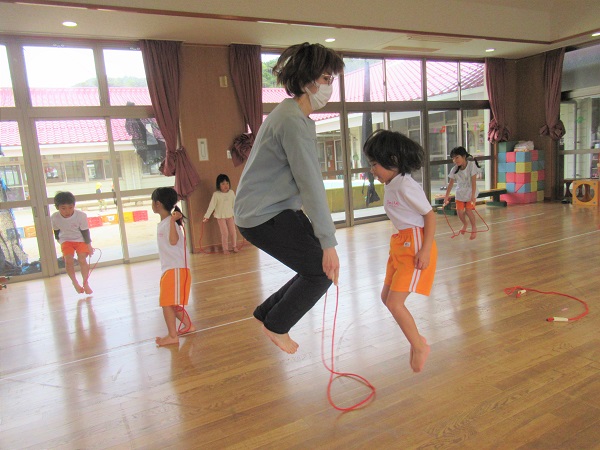 保育者やお友だちと一緒に”二人跳び”にチャレンジしました!!