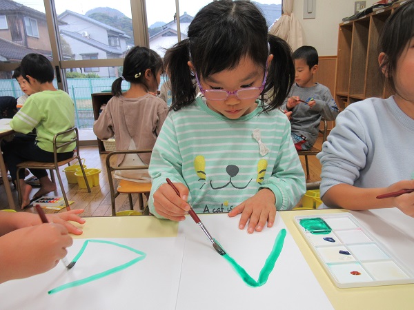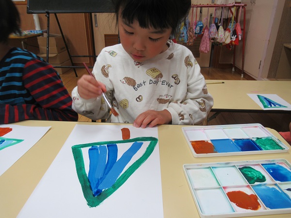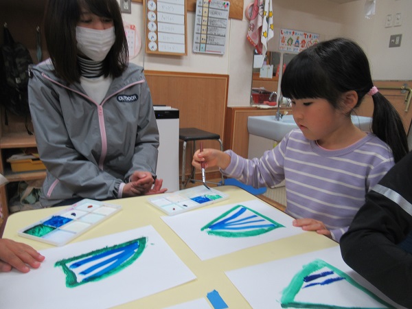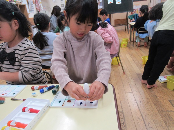 どの色の絵の具を使うのかお話をよく聞き、パレットに出してきますよ。