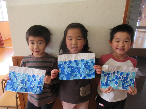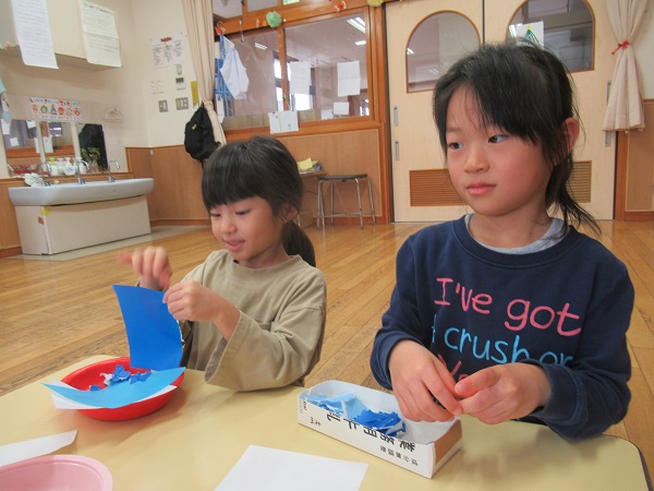 白、青、水色の折り紙を、小さすぎず、大きすぎず・・・ちょうど良い大きさに千切っていきます。