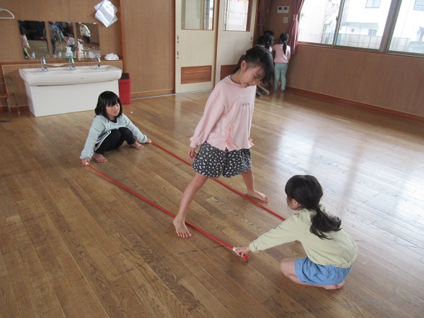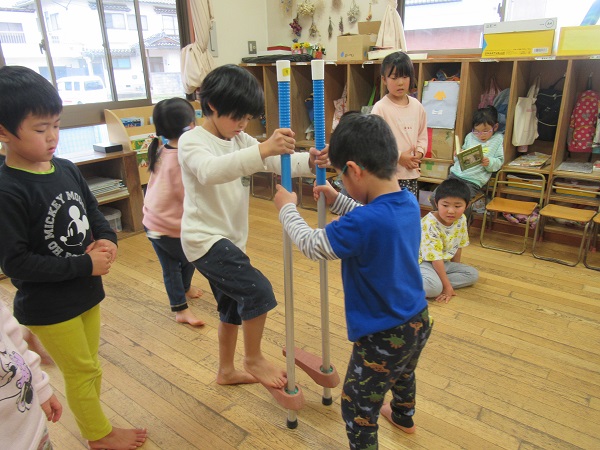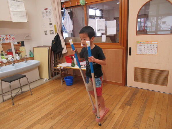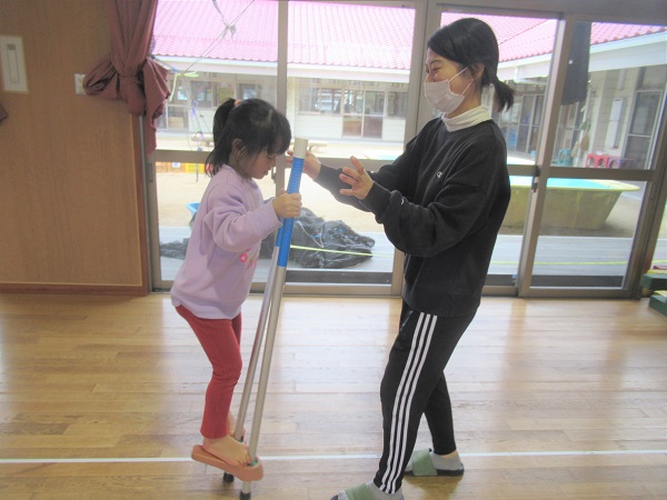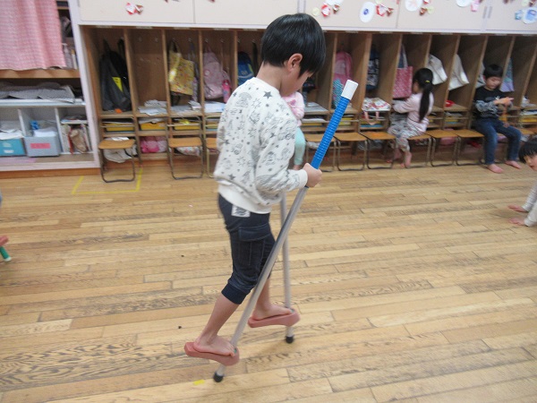 これまで補助付きで練習していた竹馬でしたが、コツを掴み、一人で乗れるようになった子が数名いました■