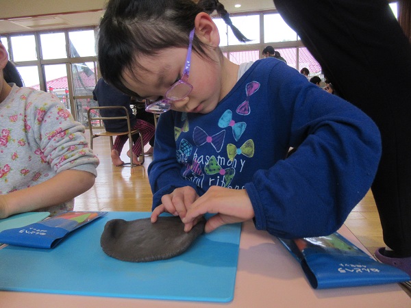 「厚さは七ミリくらいに伸ばすよ」と言われ、「どのくらいかな~?」と横から覗いてみるお友だちもいました■