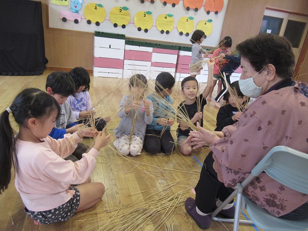ビラおおだから4名のおじいちゃん、おばあちゃんに来園して頂き、しめ縄作りを教えてもらいました。