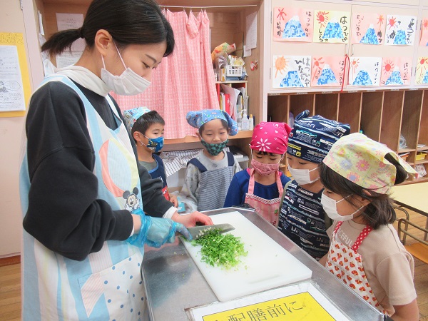 まずは保育者はトントンと細かく切っていくのを見学しました。