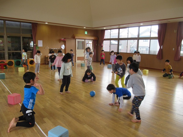 練習の後は、遊戯室で転がしドッジボールをしましたよ。