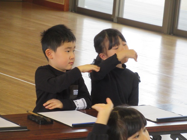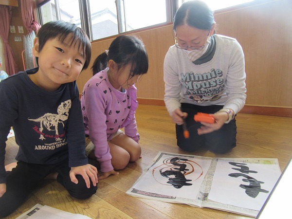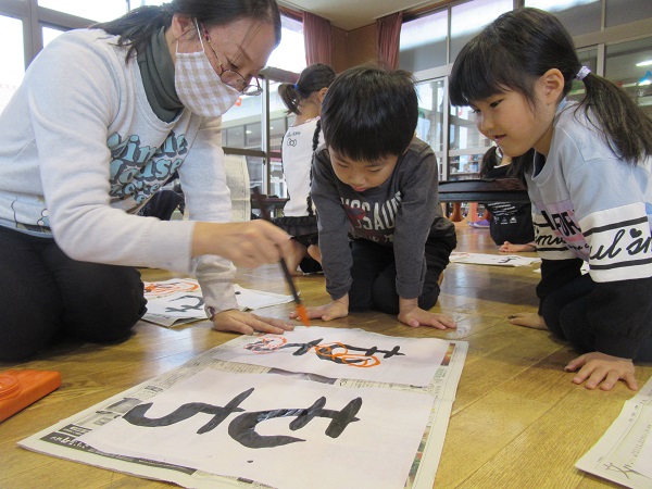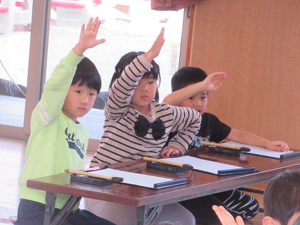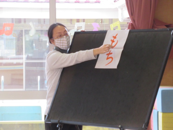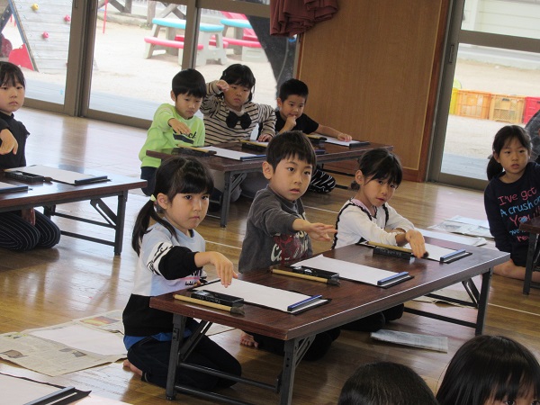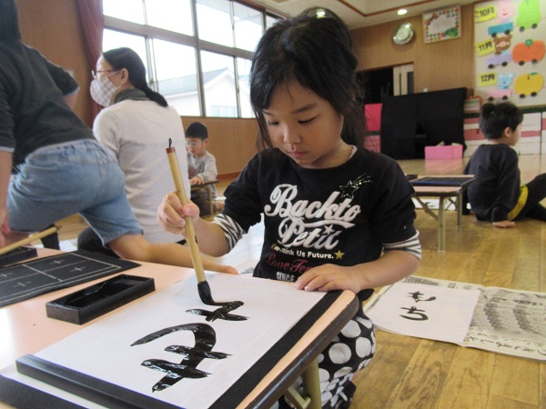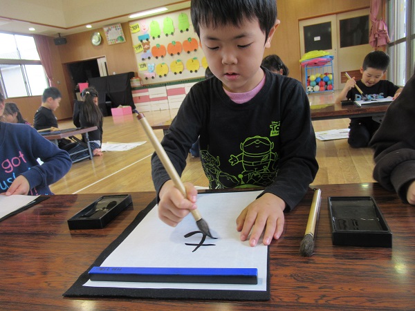 初めて「ち」を書きましたが、とっても上手に書けました。子どもたちの「もち」の字を見て