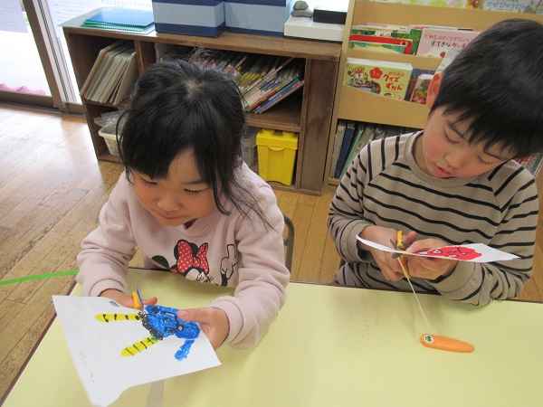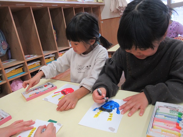 クレヨンを使って、自分の好きなように鬼の顔や角の模様を描きました。